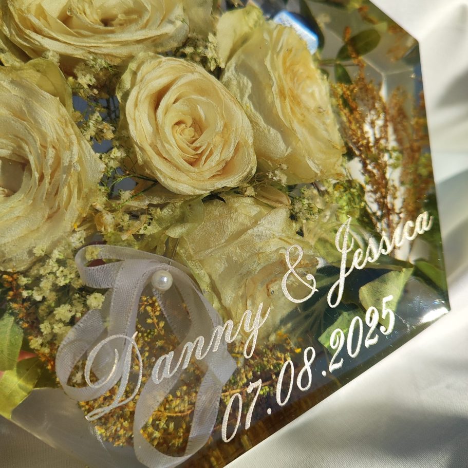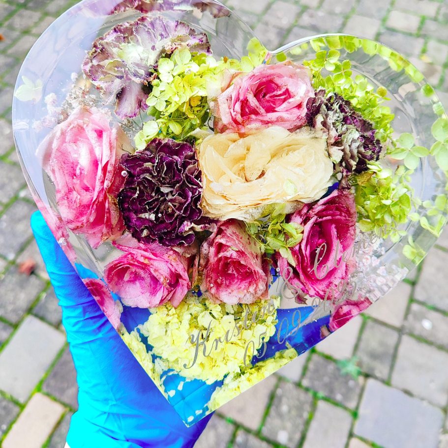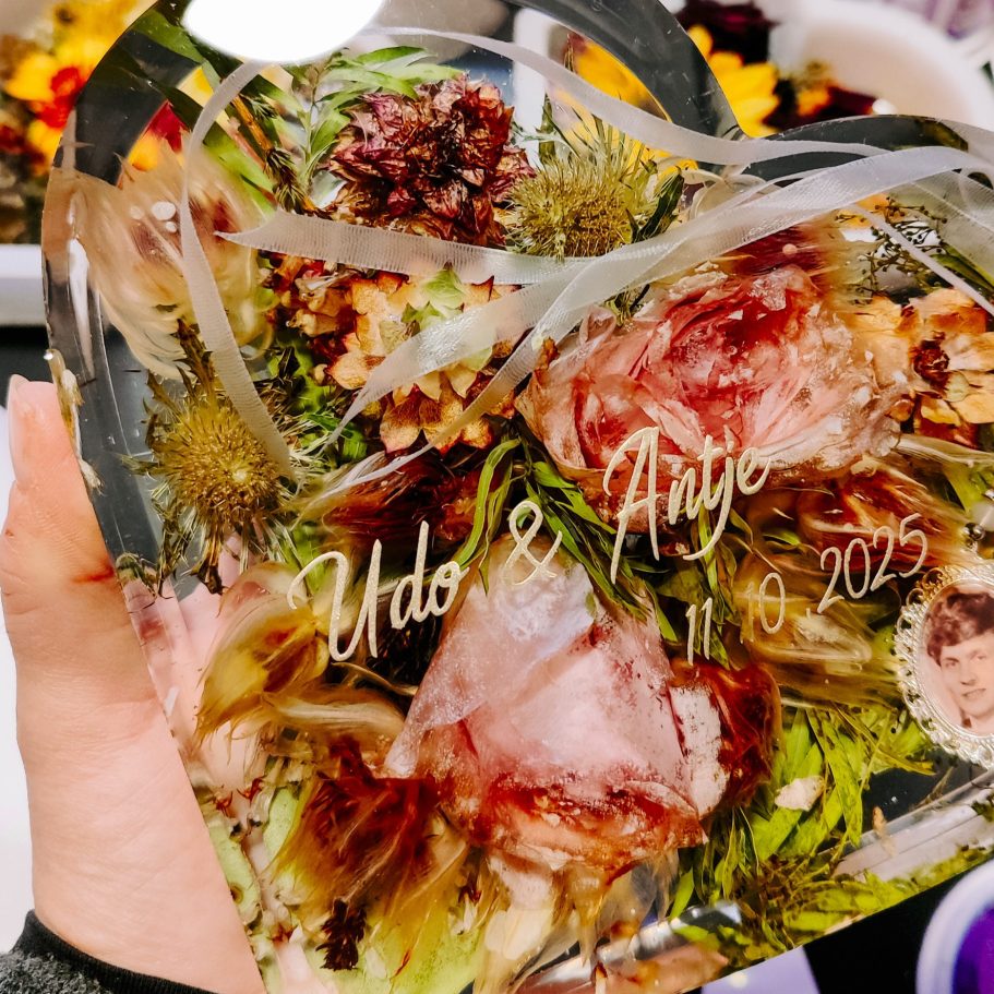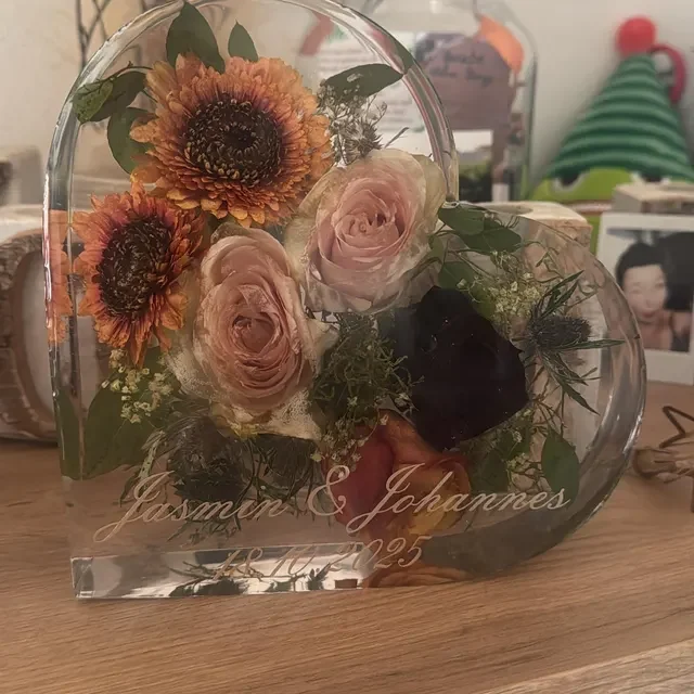 Wunderschönes Andenken. Sieht richtig schön aus, wir sind überglücklich auf diese Weise unsere Blumen und anstecker von unserer Hochzeit verewigt zu haben. Nur zu empfehlen. Danke nochmal ganz doll 🥹❤️